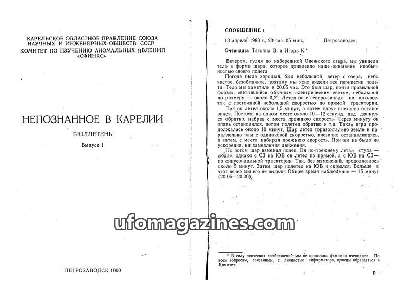 This bulletin, 'The Unknown in Karelia', Issue 1, published in 1990, compiles twelve eyewitness accounts of unidentified aerial phenomena (UAP) primarily from the Karelia region of
