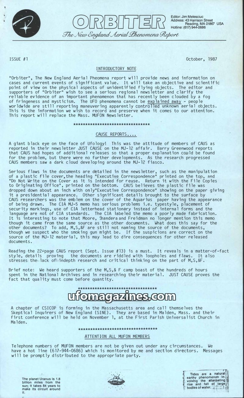 This inaugural issue of 'Orbiter' focuses on providing objective news on UFO cases, aiming to clarify reliable evidence. It critically examines the MJ-12 documents, highlighting fl