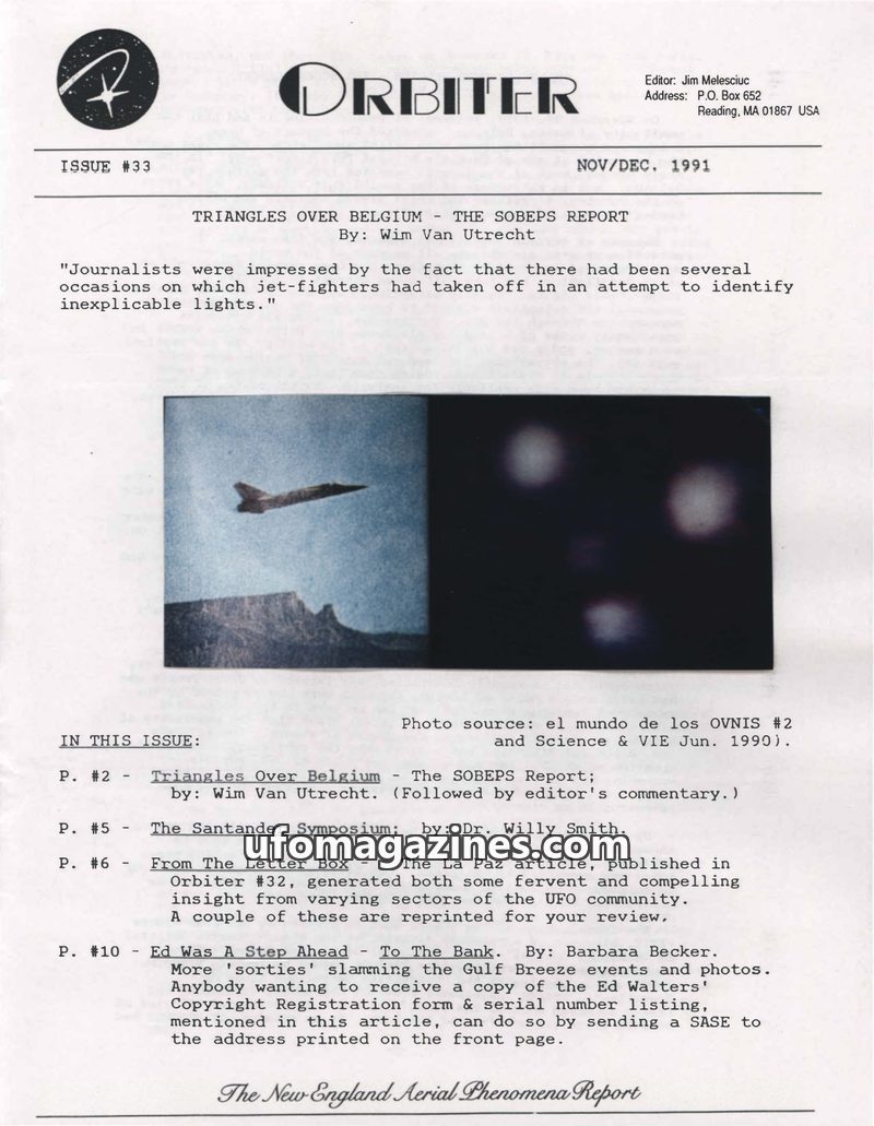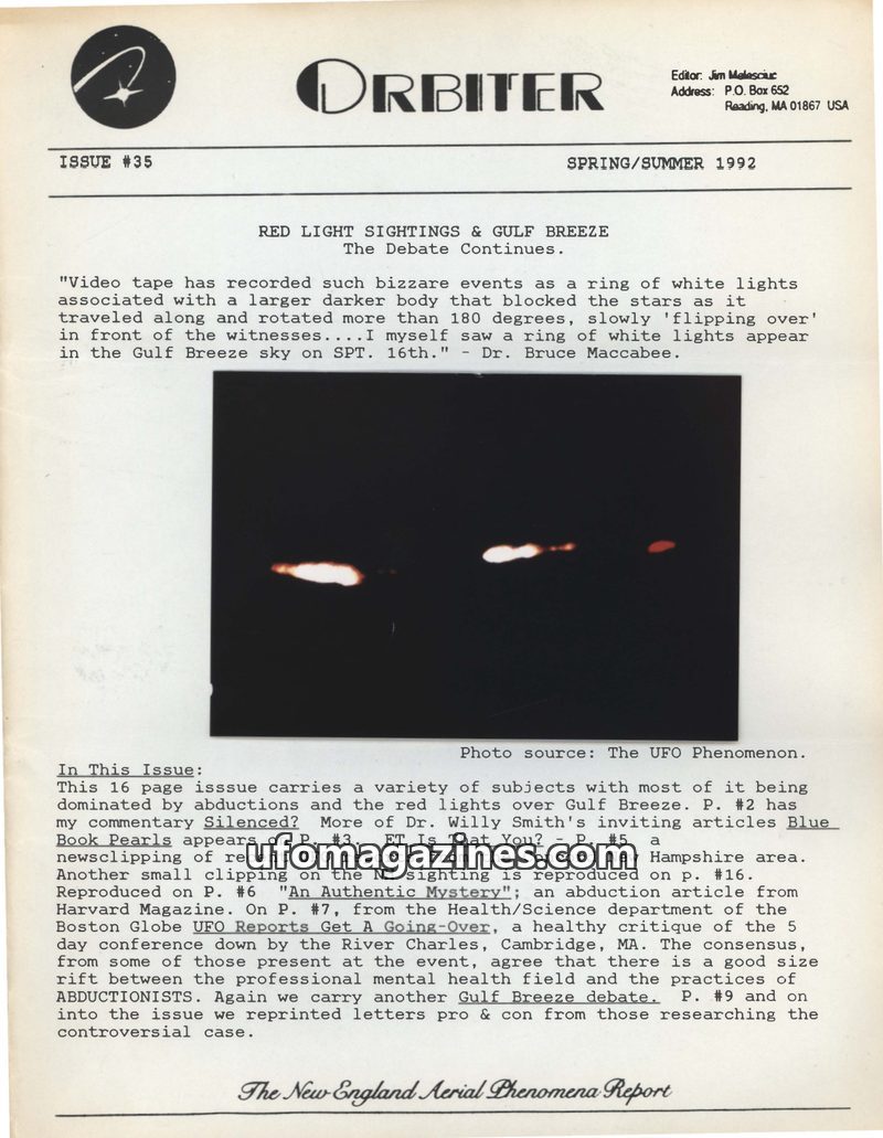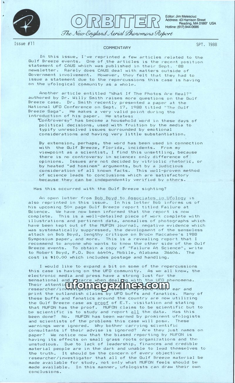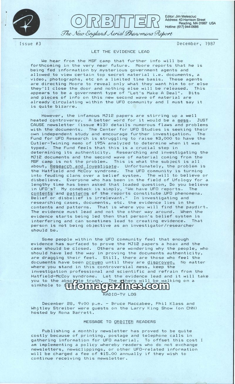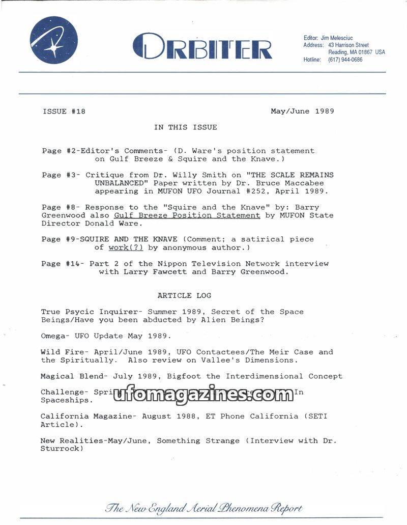 This issue of Orbiter Magazine delves into the MJ-12 controversy and the Gulf Breeze UFO sightings. Editor Jim Melesciuc comments on the 'Squire and the Knave' piece, questioning i