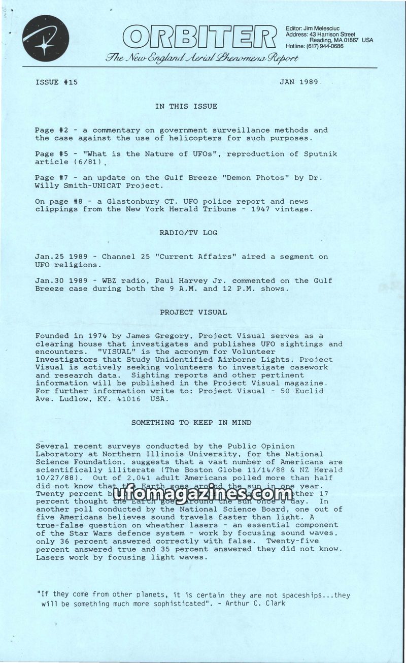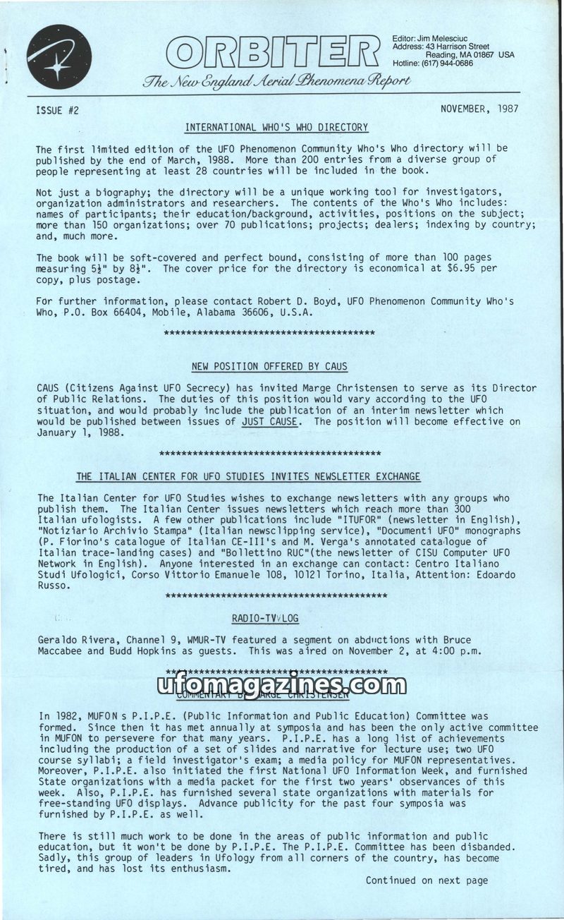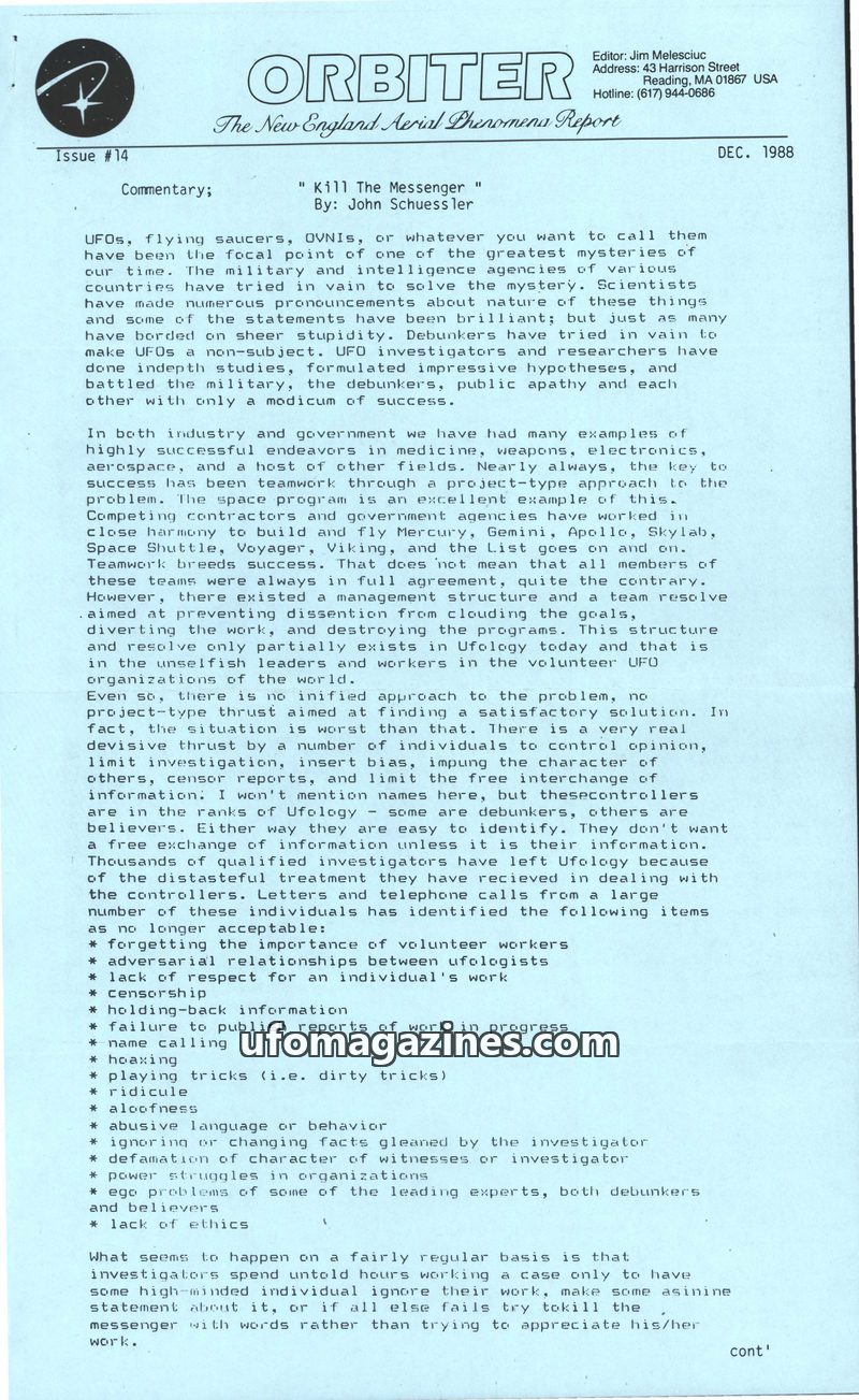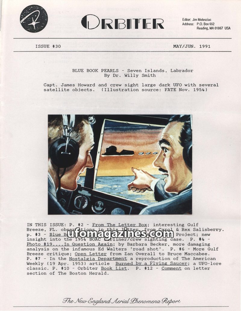 This issue of Orbiter Magazine delves into the MJ-12 controversy and the Gulf Breeze UFO sightings. Editor Jim Melesciuc comments on the 'Squire and the Knave' piece, questioning i