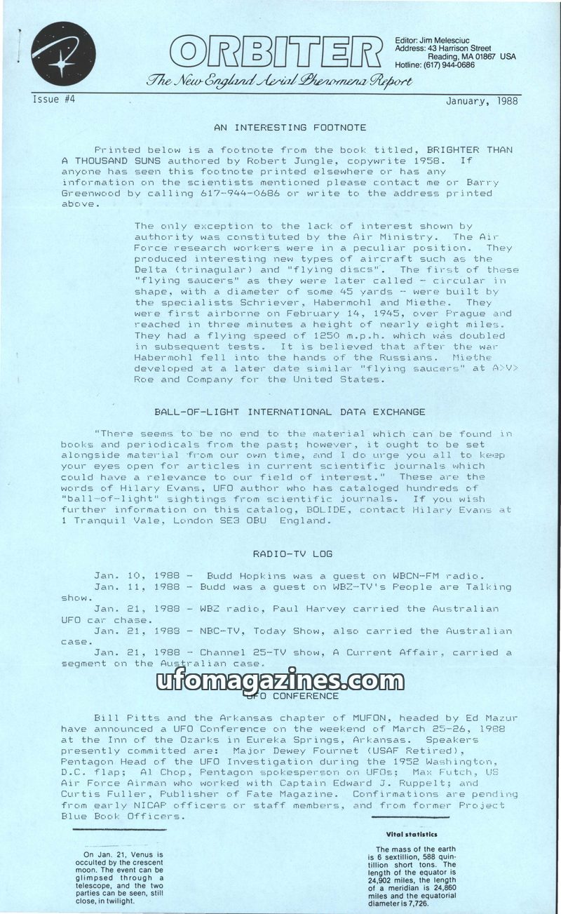 This issue of Orbiter magazine delves into various UFO phenomena, including the 'foo fighter' mystery from WWII, reports of orange balls of light (BOLs) observed globally, and the