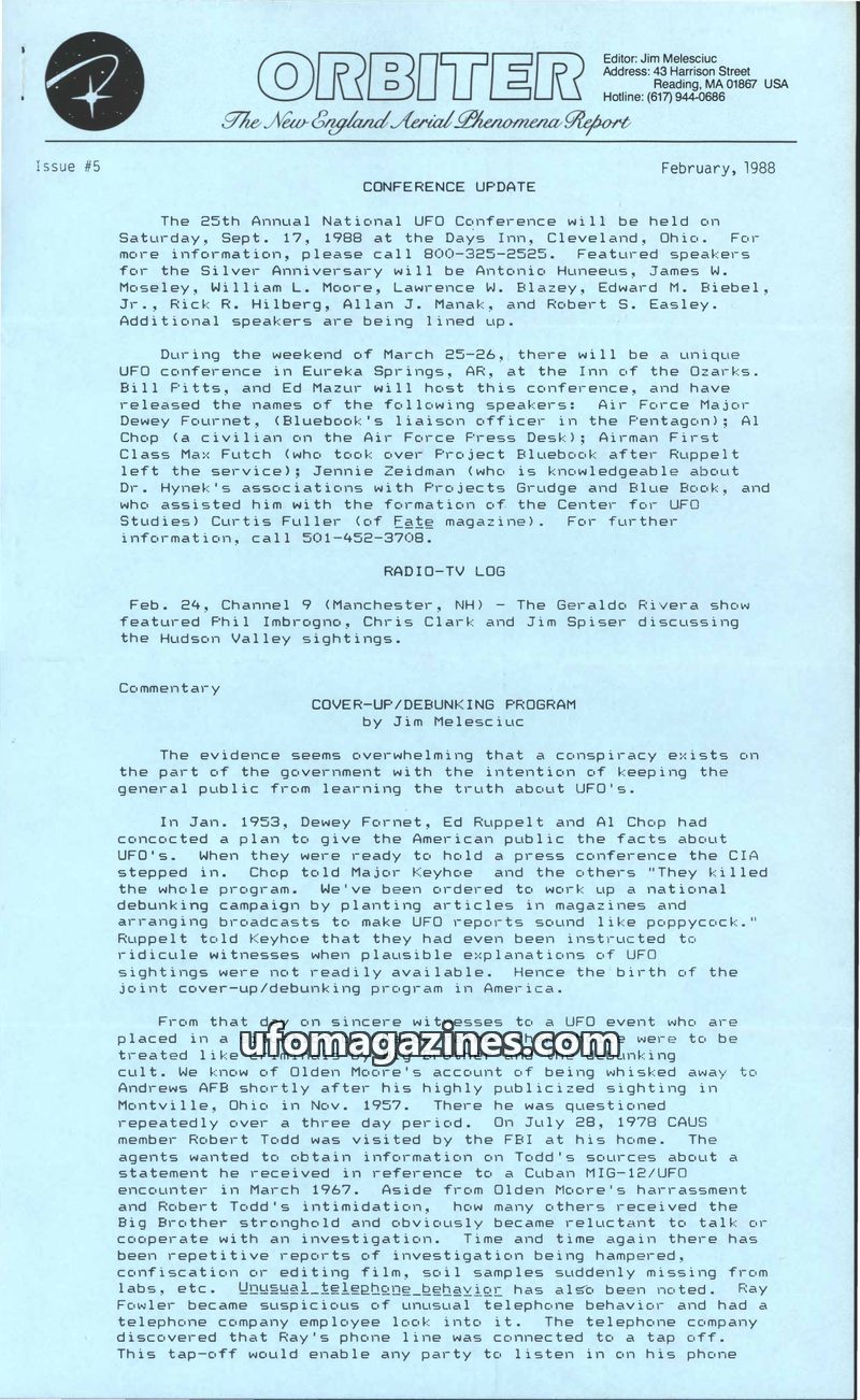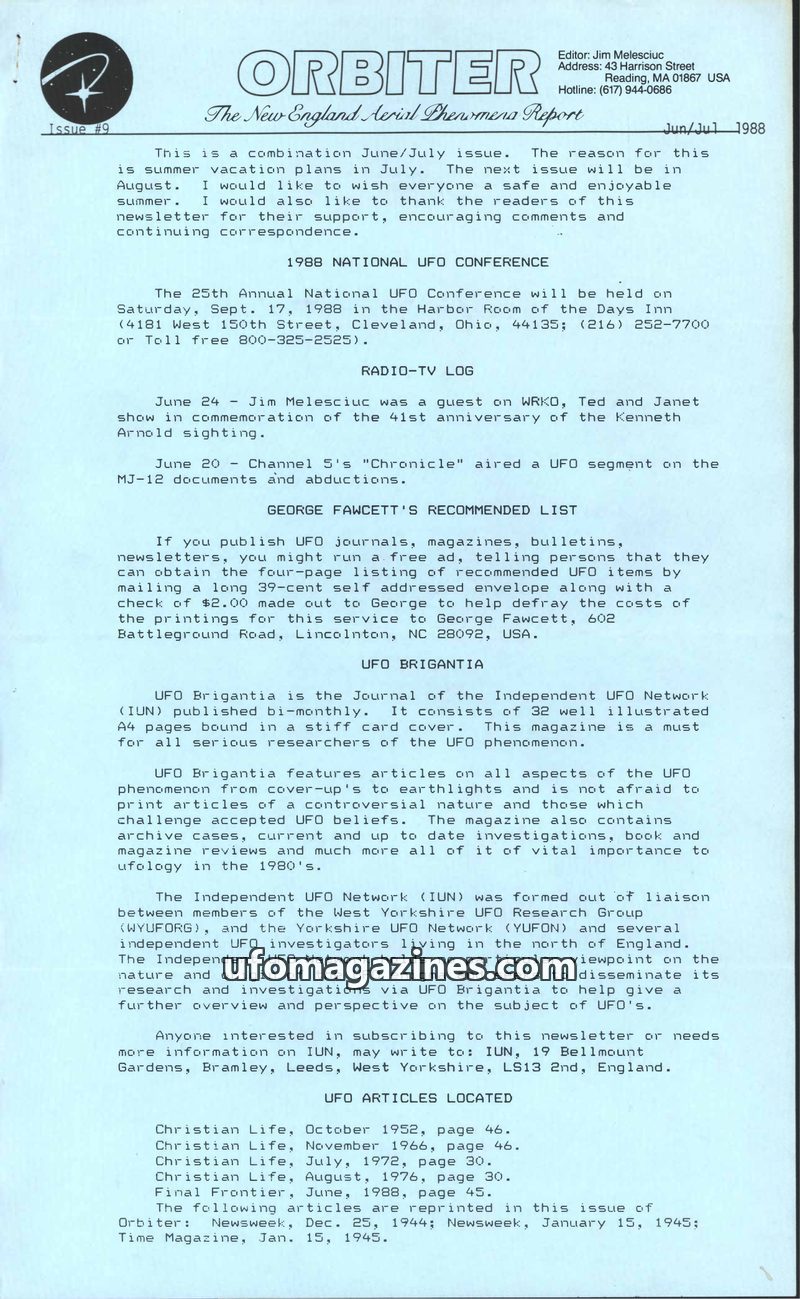 This issue of Orbiter, dated June/July 1988, covers the upcoming 1988 National UFO Conference in Cleveland, Ohio, and includes a radio-TV log of recent UFO-related media appearance