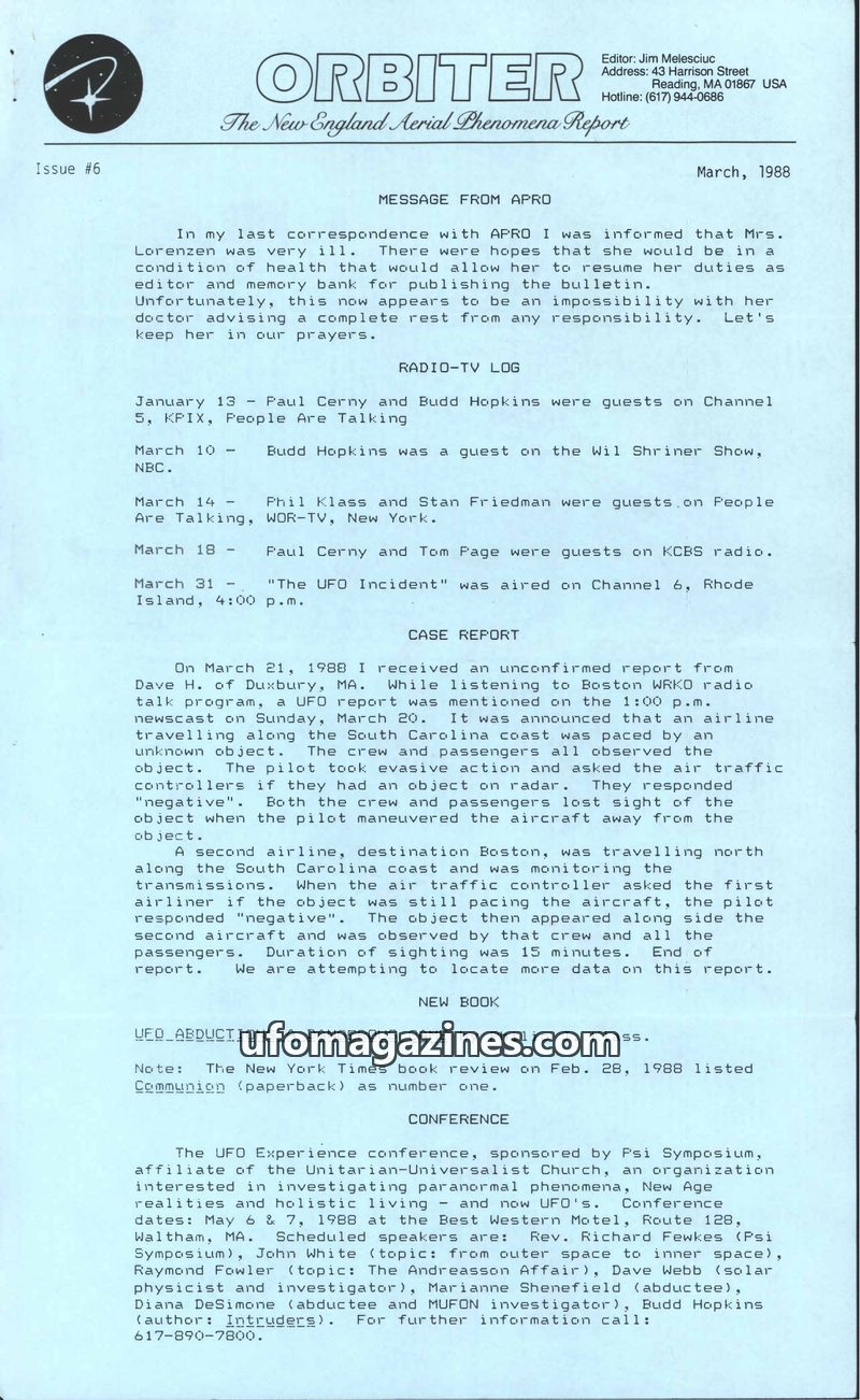 This issue of Orbiter magazine, dated March 1988, covers various UFO-related topics. It includes a message from APRO regarding Mrs. Lorenzen's health, a radio-TV log of appearances