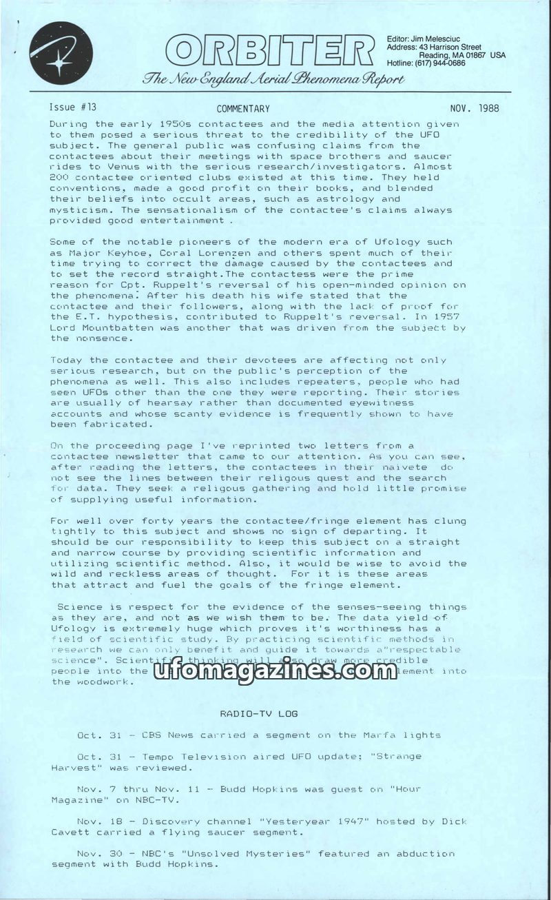 This issue of Orbiter magazine, dated November 1988, critiques the sensationalism of 'contactee' claims in ufology and advocates for a scientific approach. It reports on Brazilian
