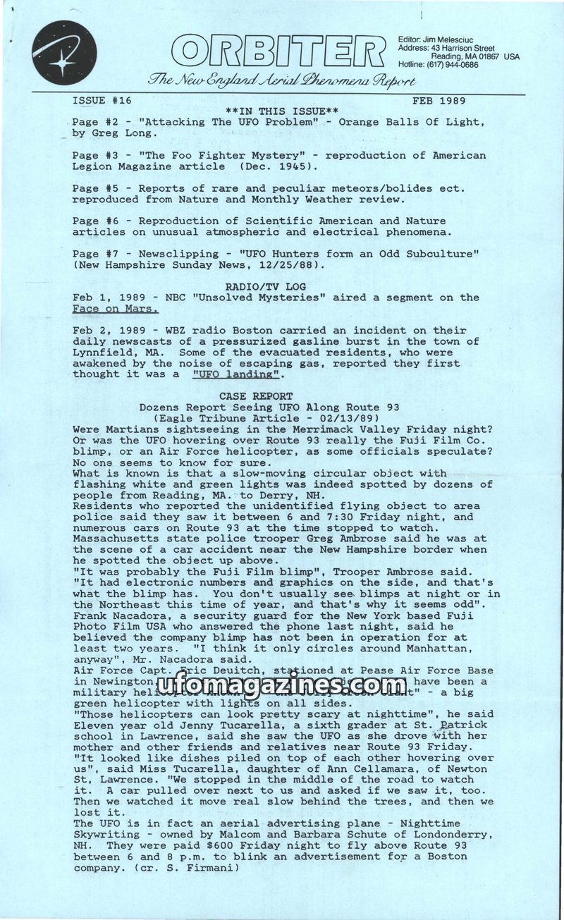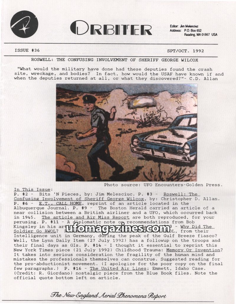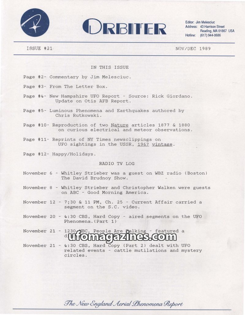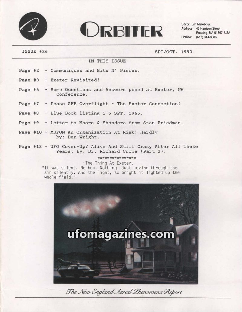 This issue of Orbiter focuses on the 25th anniversary of the Exeter UFO Incident, detailing witness accounts from Norman Muscarello, Patrolmen Toland and Bertrand, and the subseque
