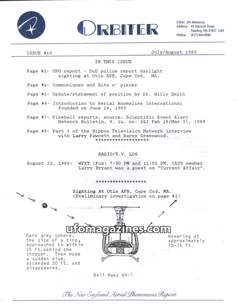 This issue of Orbiter features a detailed report on a daylight UFO sighting at Otis Air Force Base by DoD police, describing a dark grey sphere that exhibited unusual maneuvers. It