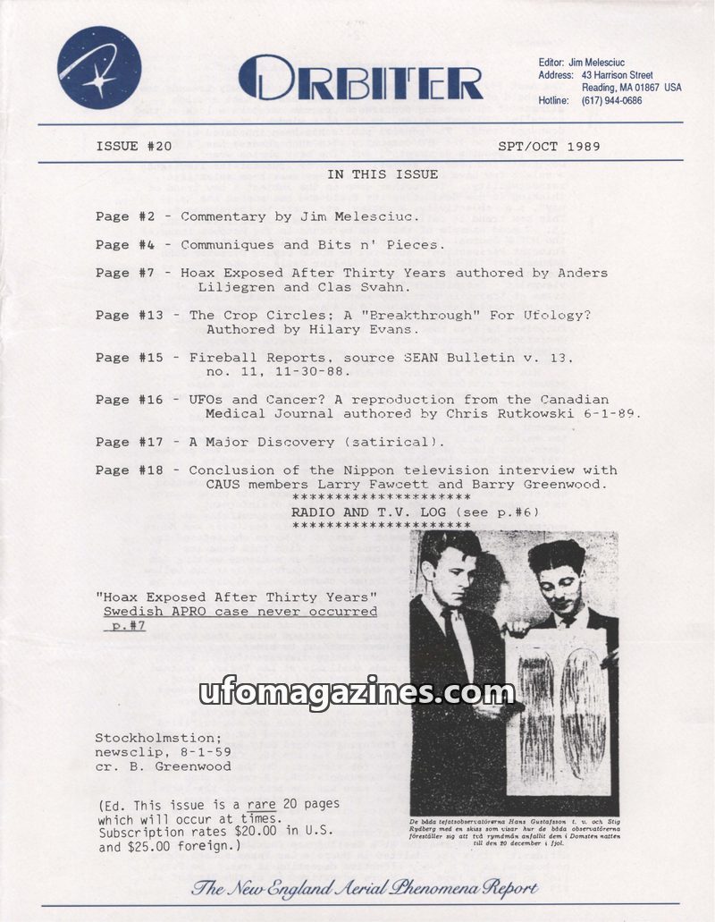 This issue of Orbiter magazine (Issue #20, Sept/Oct 1989) critically examines the ufology field, particularly the 'futurist' perspective promoted by figures like John Schuessler, w