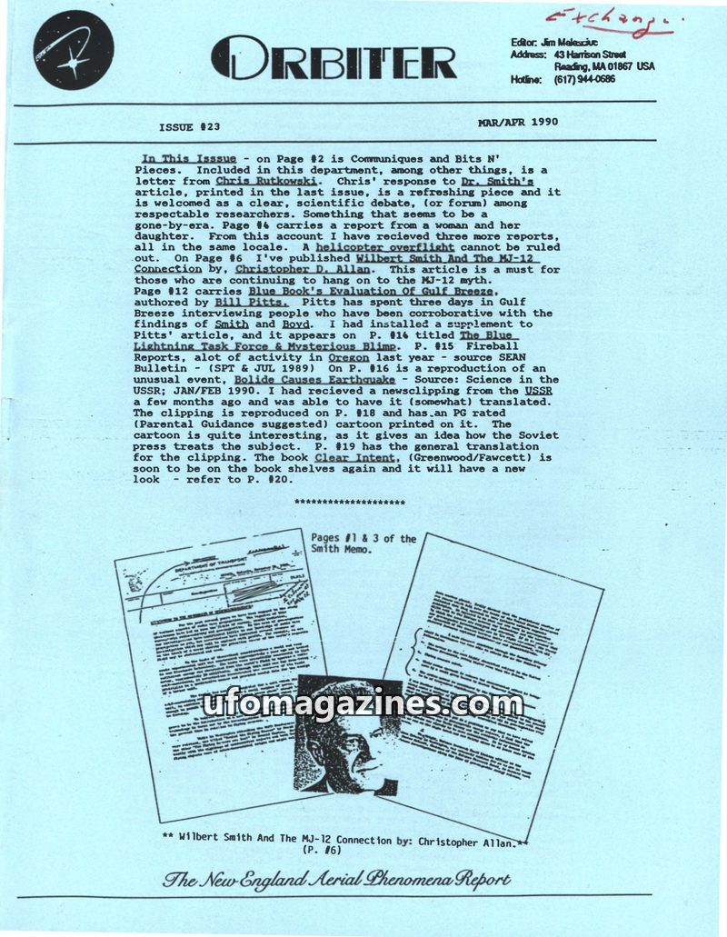 This issue of Orbiter delves into the controversial MJ-12 documents, examining the work of Canadian ufologist Wilbert Smith and his Project Magnet. It also features a report on a U