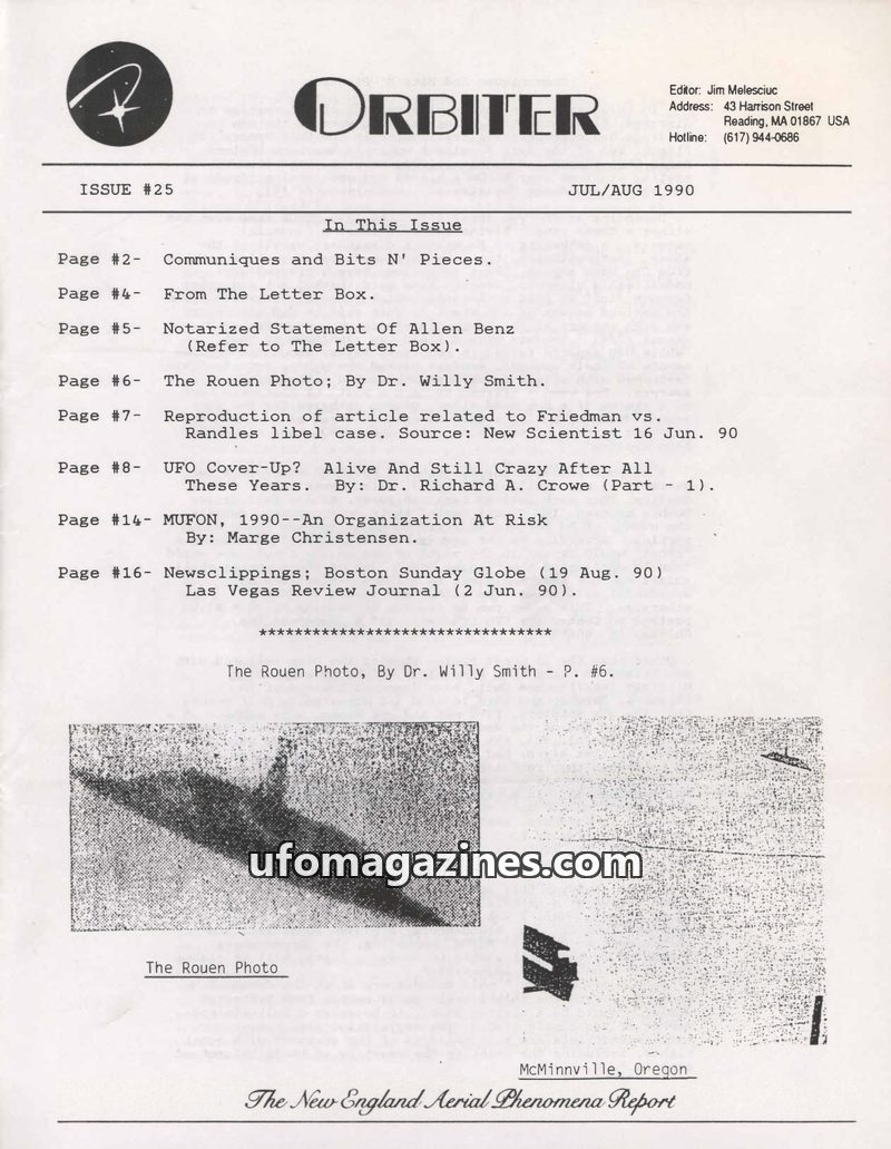 This issue of Orbiter magazine, dated July/Aug 1990, delves into various UFO-related topics. It features an in-depth analysis of 'The Rouen Photo' by Dr. Willy Smith, questioning i