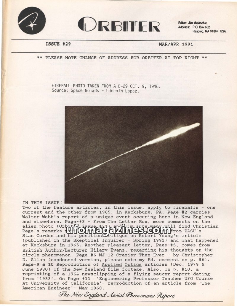 This issue of Orbiter magazine covers a range of aerial phenomena and related controversies. It features reports on a major fireball observed in New England in March 1991, a histor