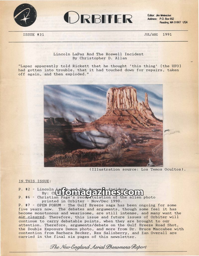 This issue of Orbiter delves into the Roswell Incident, focusing on the involvement of scientist Lincoln LaPaz and questioning witness testimony, particularly that of Bill Rickett.