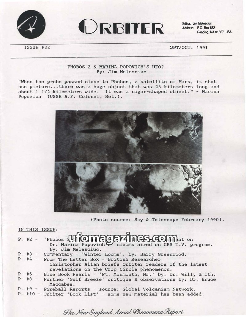 This issue of Orbiter magazine, dated September/October 1991, features an article by Jim Melesciuc discussing the claims made by Dr. Marina Popovich regarding a cigar-shaped object