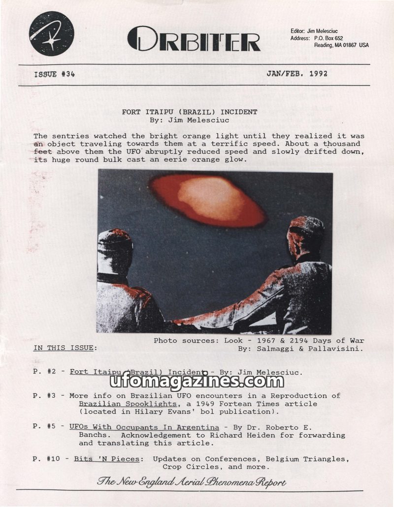 This issue of Orbiter magazine focuses on several UFO-related incidents and phenomena. The lead article details the Fort Itaipu (Brazil) Incident of 1957, where sentries witnessed