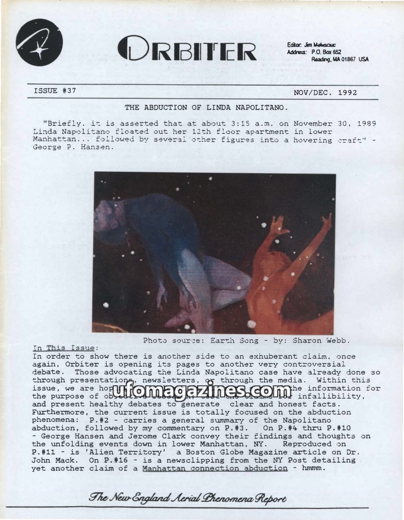 This issue of Orbiter focuses on the controversial Linda Napolitano abduction case, presenting information for objective research and debate. It details Napolitano's claims of bein