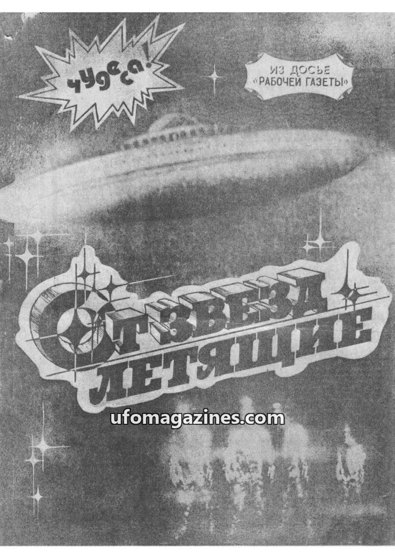 This issue of 'Flying Stars' magazine, published by 'Rabochaya Gazeta', delves into the phenomenon of Unidentified Flying Objects (UFOs) and potential extraterrestrial contact. It