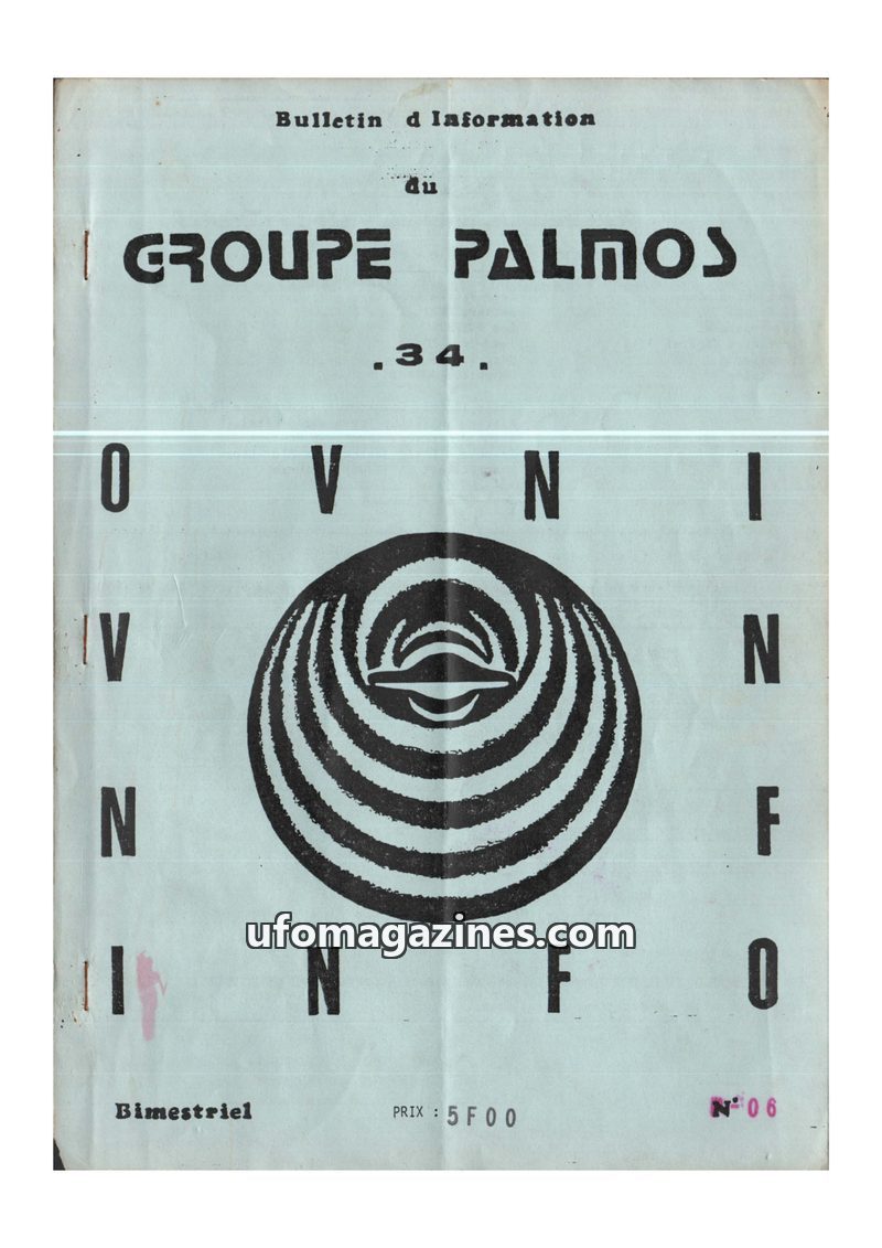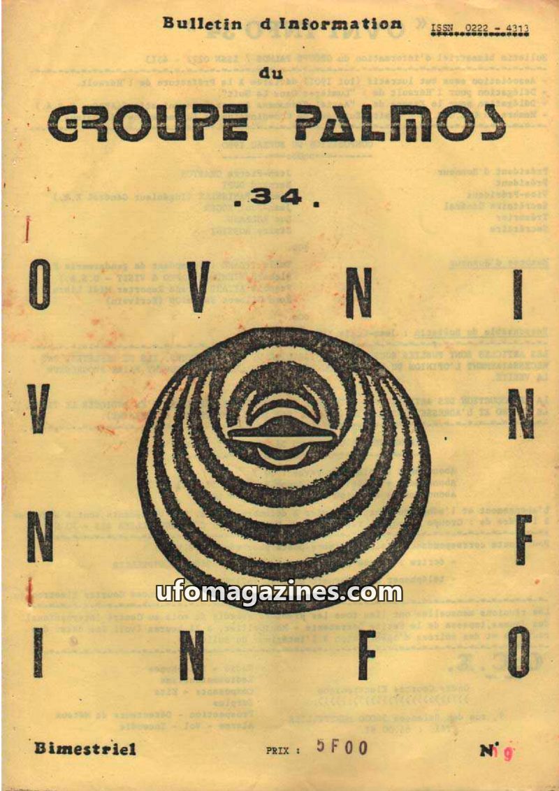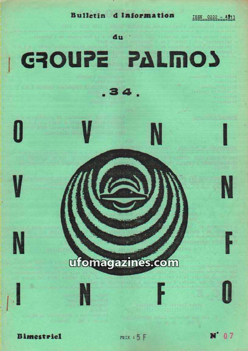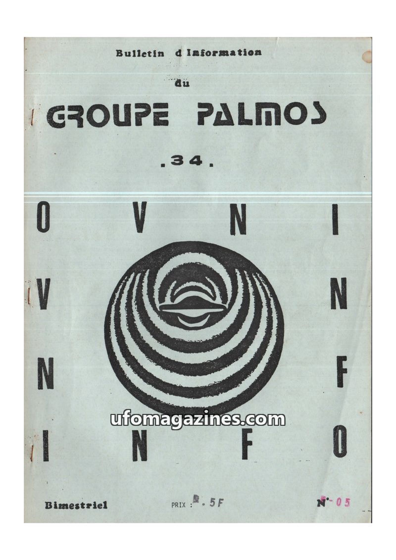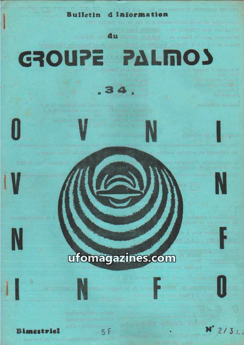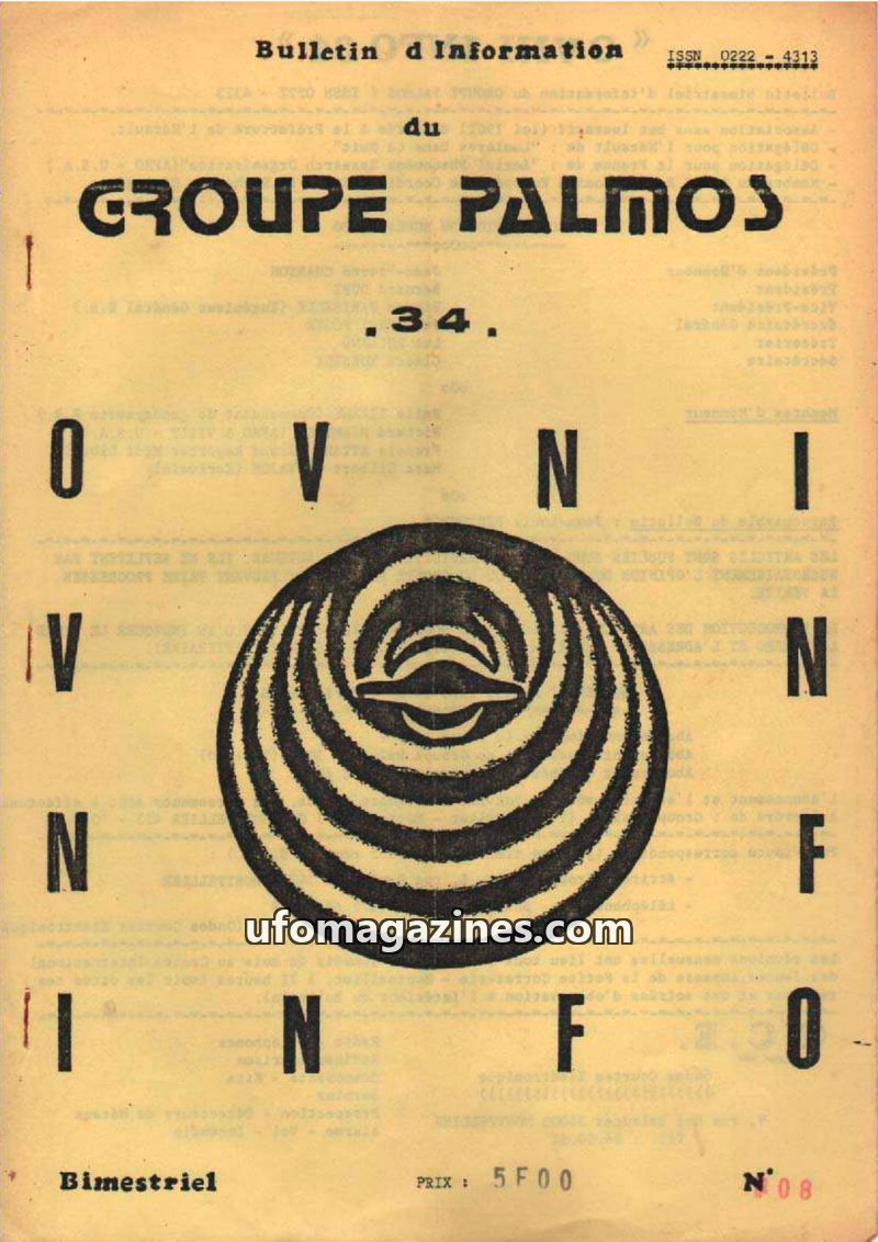 This issue of OVNI-INFO 34, published by GROUPE PALMOS, details the organization's activities and UFO reports from the 1970s. It highlights key dates in the group's history, includ