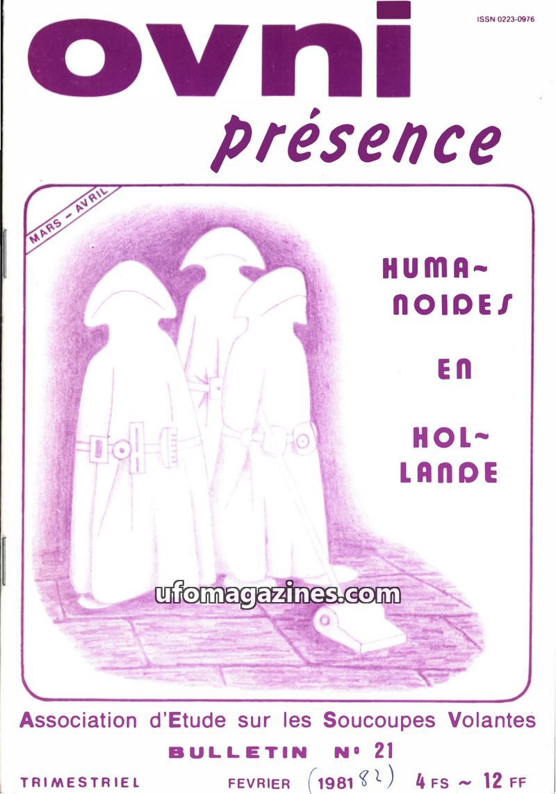 This issue of Ovni Présence (No. 21, Feb 1982) delves into ufological analysis and case studies. It features an interview with Michel Carrouges, who discusses his 'mental dioptrics