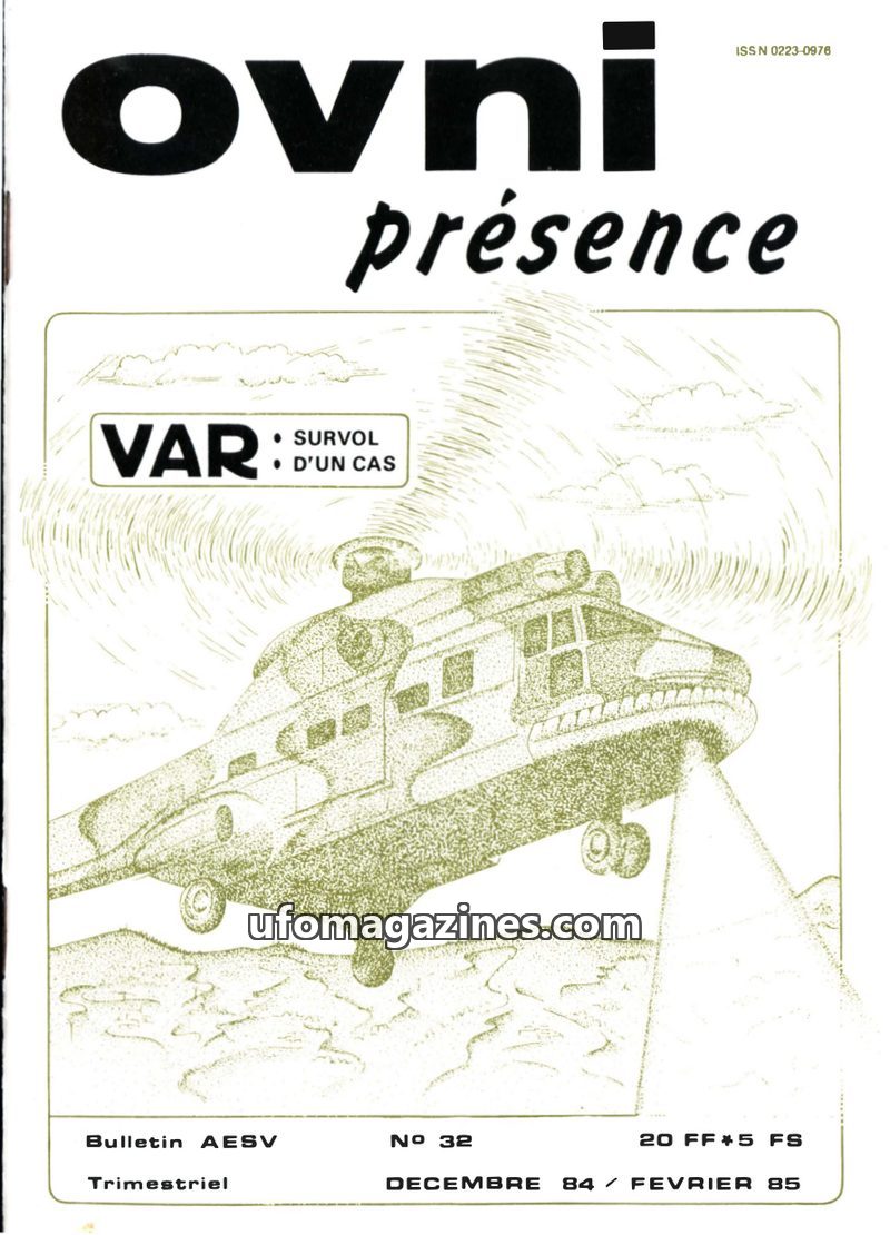 This issue of Ovni Présence (No. 32, Dec 1984/Feb 1985) focuses on a UFO sighting in Le Luc, Var, France, on October 22, 1984, which was later identified as a Puma SA 330 helicopte
