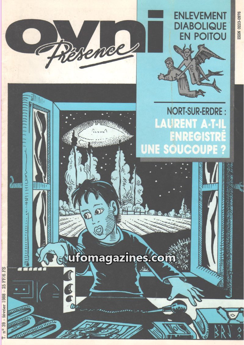 This issue of OVNI Présence from February 1988 covers a range of ufological topics, including a potential UFO sighting recorded by a young boy in Nort-sur-Erdre, France. It also de