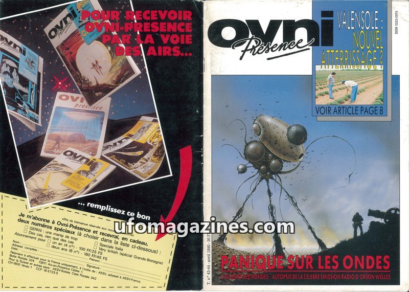 This issue of Ovni-Présence (April 1990) delves into significant UFO-related events. It covers the historical panic caused by Orson Welles's 'War of the Worlds' radio broadcast and