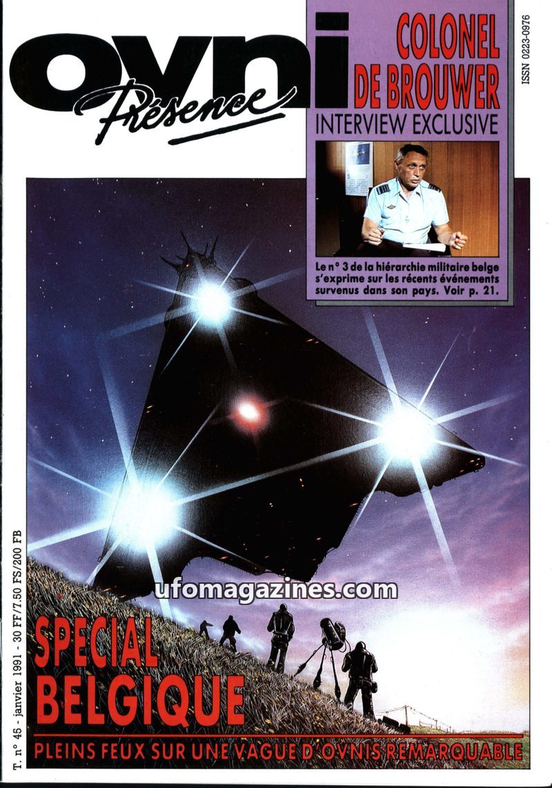 This issue of OVNI Présence details the significant UFO wave that occurred in Belgium from late 1989 to mid-1990, with over 1000 reported sightings. It features an exclusive interv