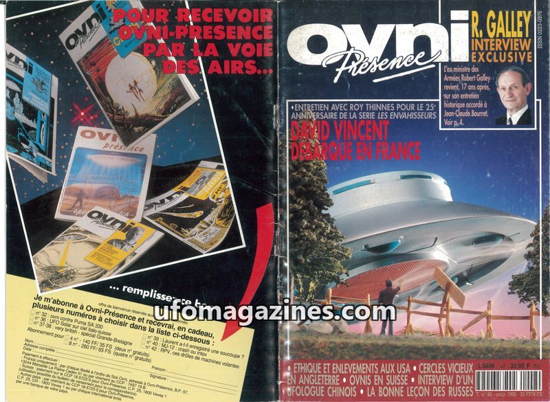 This issue of OVNI-PRESENCE (August 1992) features an exclusive interview with former Minister of the Armies, Robert Galley, who clarifies his 1974 UFO declaration, stating it was