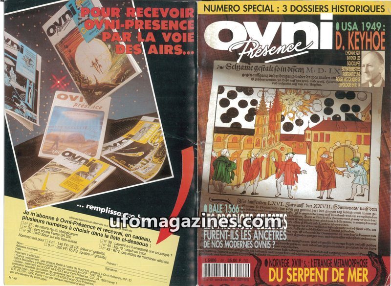 This issue of Ovni-Présence focuses on historical UFO phenomena and key figures in ufology. It delves into the 16th-century Wickiana collection, featuring celestial events and 'pro