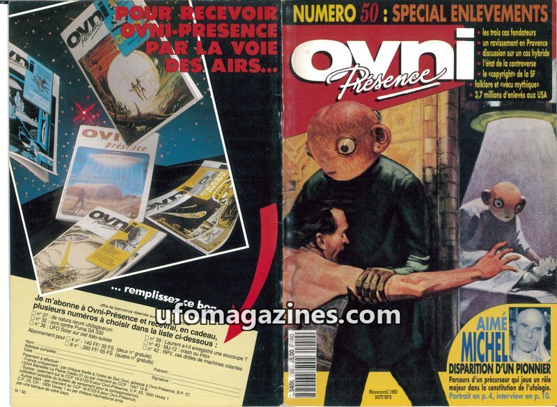 This issue of OVNI-PRESENCE (No. 50) is a special edition dedicated to UFO abductions, featuring a tribute to the late ufologist Aimé Michel. It explores historical abduction cases
