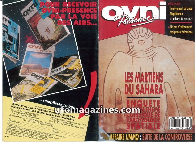 This issue of Ovni-Présence delves into the 'Martians of the Sahara' legend, tracing its origins and debunking pseudoscientific interpretations of ancient rock art. It also feature