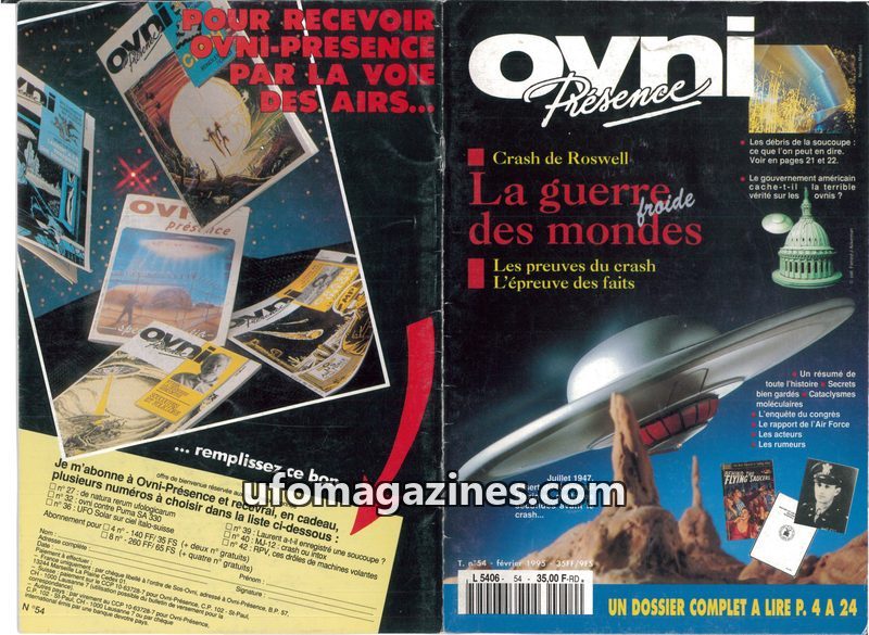This issue of Ovni-Présence delves into the Roswell UFO incident, presenting various theories and analyses. It discusses the US Air Force's official explanation of Project Mogul ba