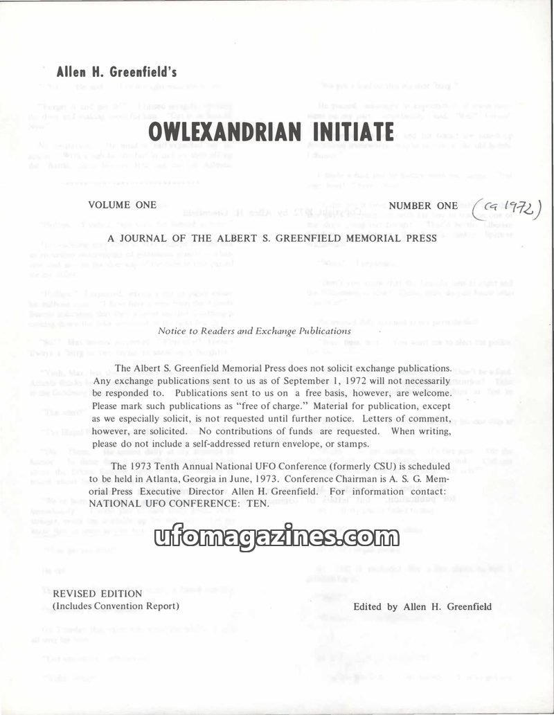 This issue of the Owlexandrian Initiate, Volume One Number One, published by the Albert S. Greenfield Memorial Press around 1972, presents a libertarian manifesto titled 'An Altern