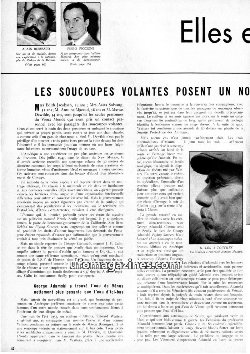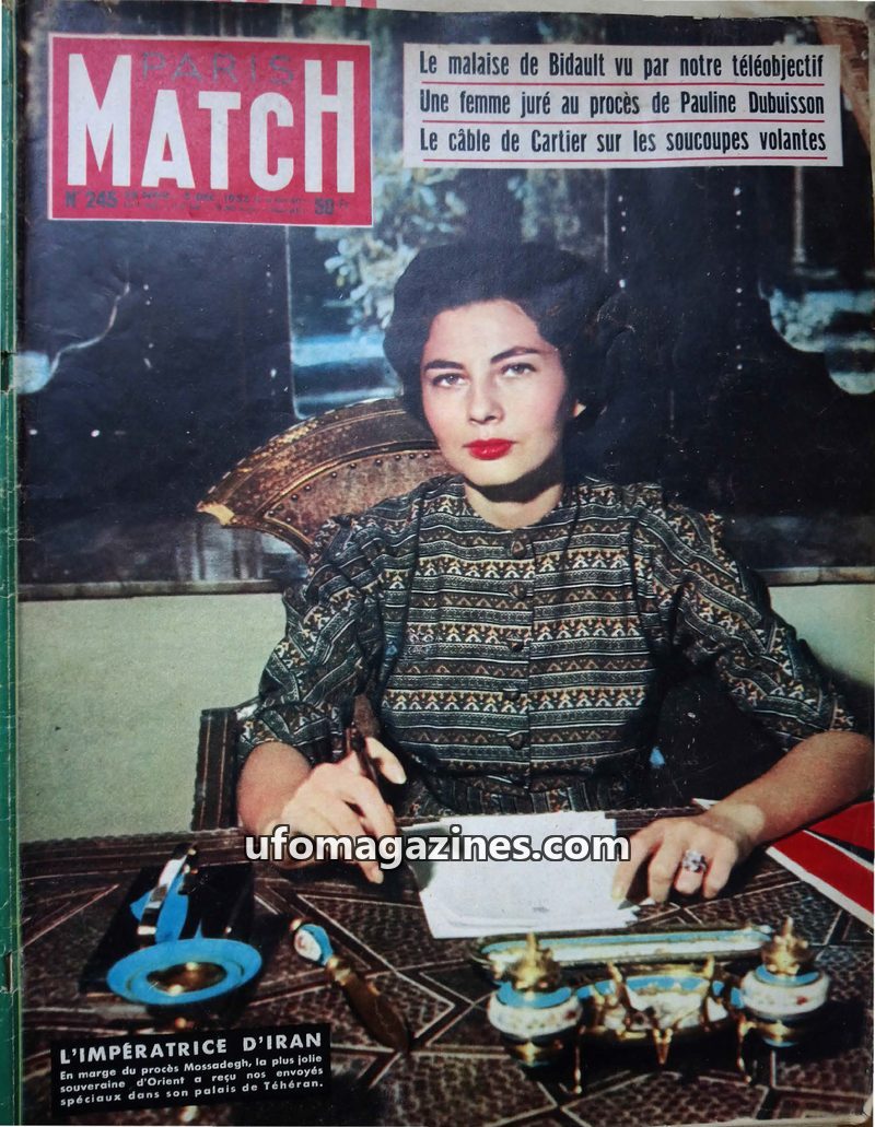 This issue of Paris Match features an article detailing George Adamski's meeting with Queen Juliana of the Netherlands, where he presented himself as a space traveler and philosoph