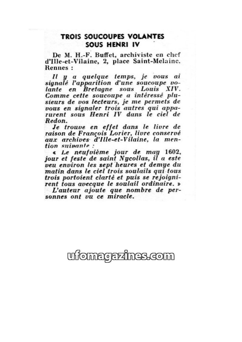 This document reports on historical accounts of flying saucers. Archivist H.-F. Buffet of Ille-et-Vilaine shared an account of a flying saucer sighting in Brittany during the reign
