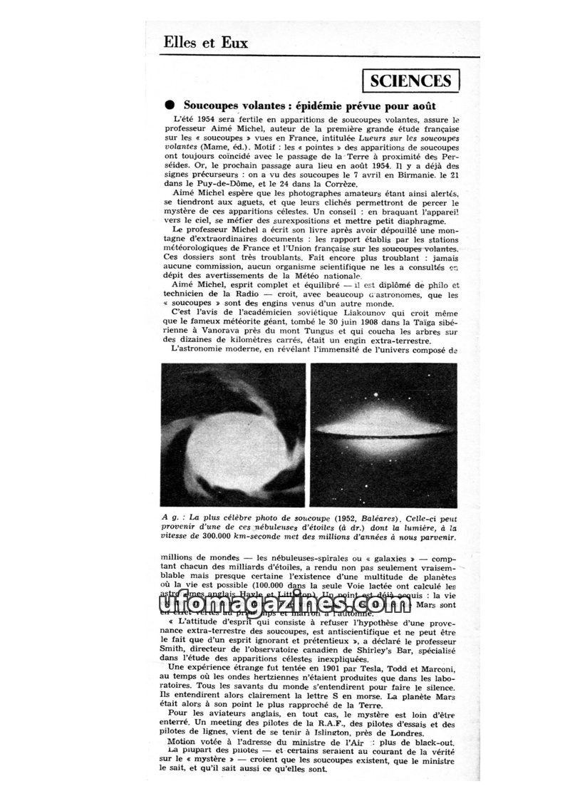 This issue of 'Elles et Eux' delves into the phenomenon of flying saucers and alleged extraterrestrial visitors. It details early encounters in the US, including the controversial
