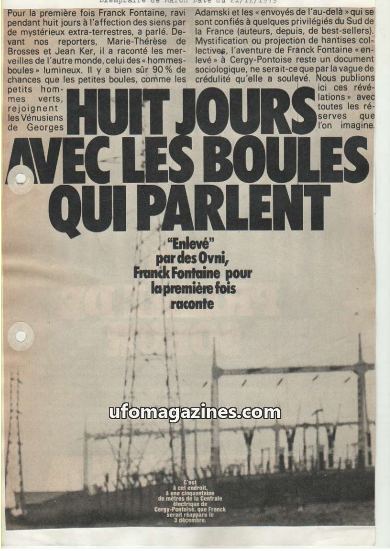 The magazine details the alleged eight-day abduction of Franck Fontaine by luminous spheres in Cergy-Pontoise, France. Fontaine claims he was taken to a laboratory and communicated