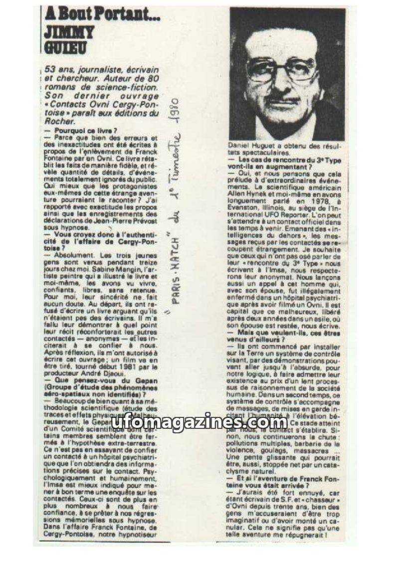 This issue features an interview with journalist and author Jimmy Guieu, who discusses his book 'Contacts Ovni Cergy-Pontoise'. Guieu asserts the authenticity of the Franck Fontain