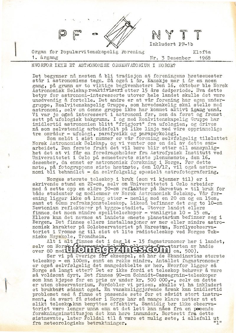 This issue of PF NYTT focuses on the state of astronomy in Norway, questioning the lack of observatories and comparing it to Sweden. It details the re-establishment of the Norsk As