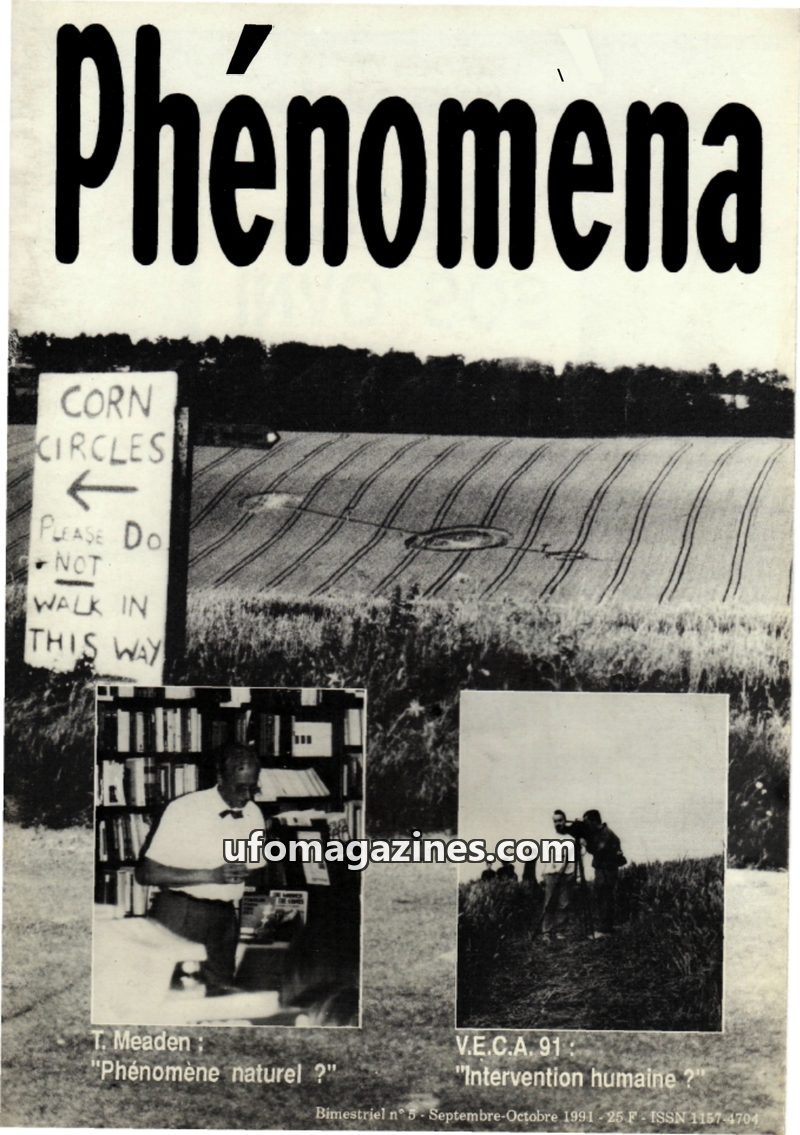 This issue of Phénomèna, published by SOS OVNI, focuses on the phenomenon of crop circles and related UFO reports. It details the case of Simone Mendez, a US Air Force telecommunic