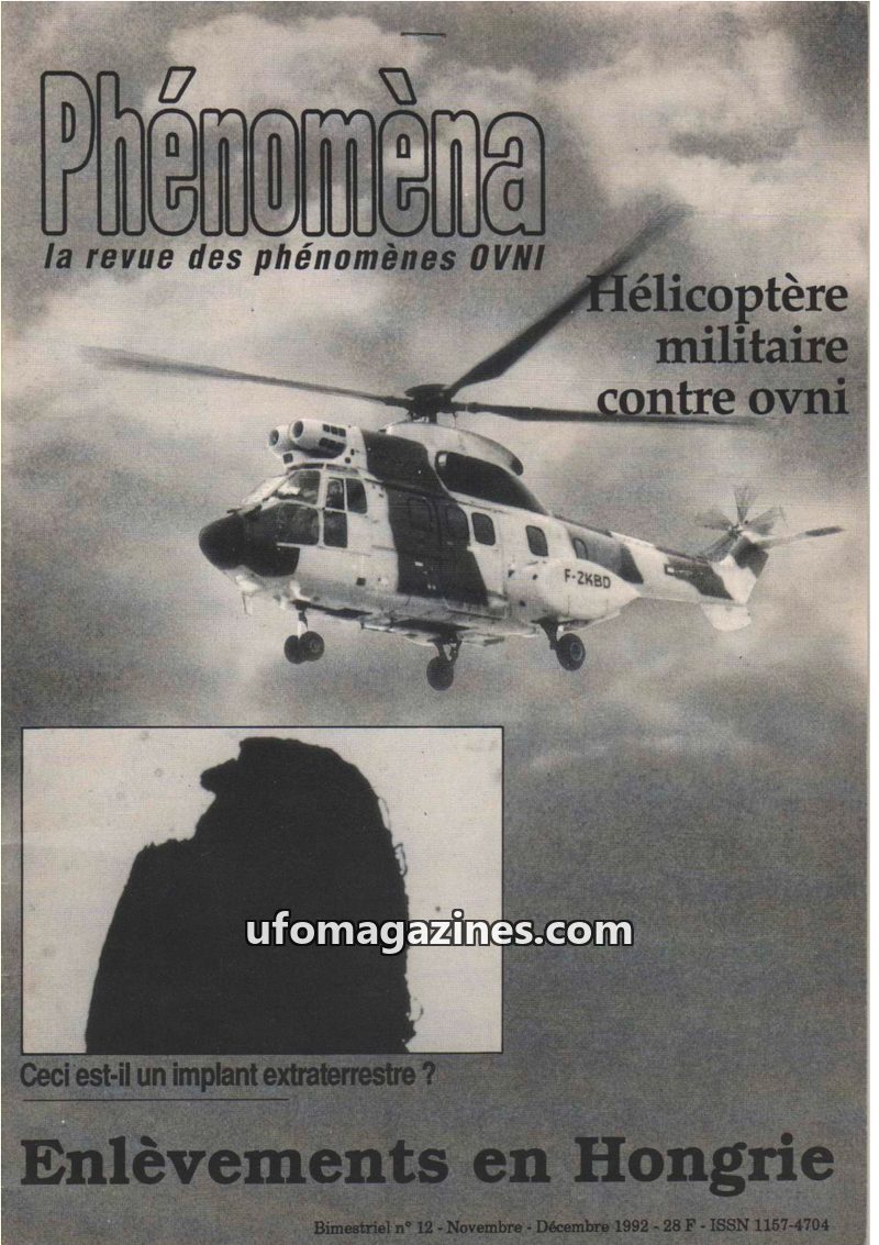 This issue of Phénomèna focuses on UFO phenomena, featuring an article about a French military helicopter encountering an unidentified object. It also delves into the case of Richa