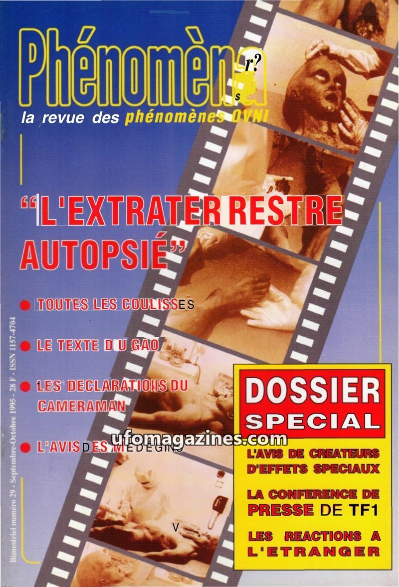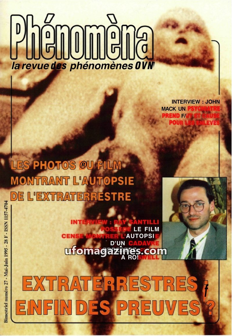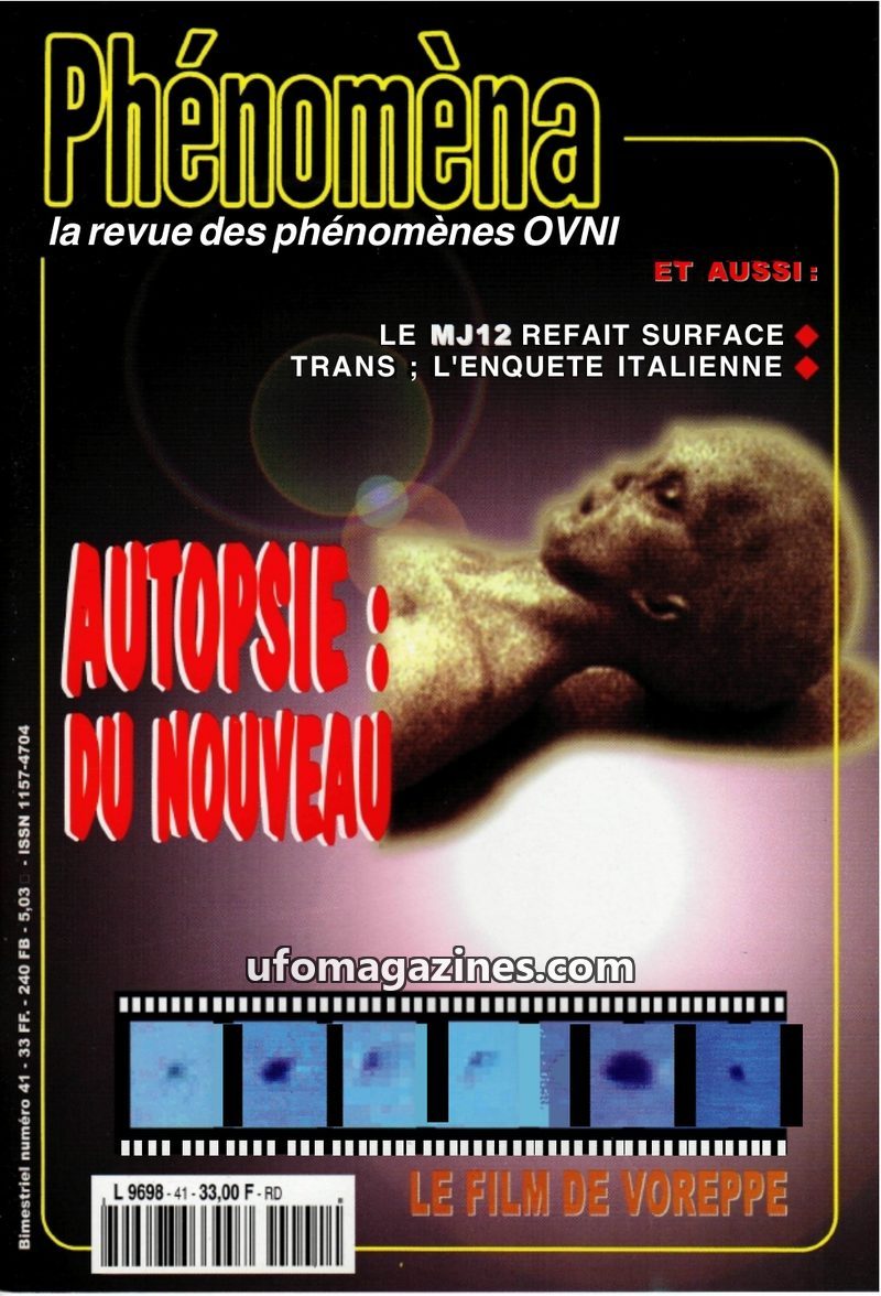 This issue of Phénomèna focuses on the controversial film allegedly showing the autopsy of an extraterrestrial from the 1947 Roswell crash. Ray Santilli, the film's owner, provides