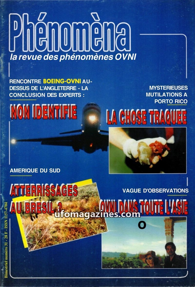 This issue of Phénomèna, dated January-February 1996, delves into several intriguing topics. It reports on a Boeing-OVNI encounter over England, with expert conclusions of 'non-ide