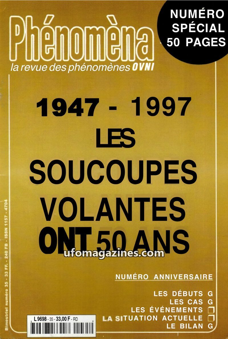This special anniversary issue of Phénomèna celebrates 50 years of flying saucer phenomena, focusing on the pivotal year of 1947. It details early sightings, including the Kenneth