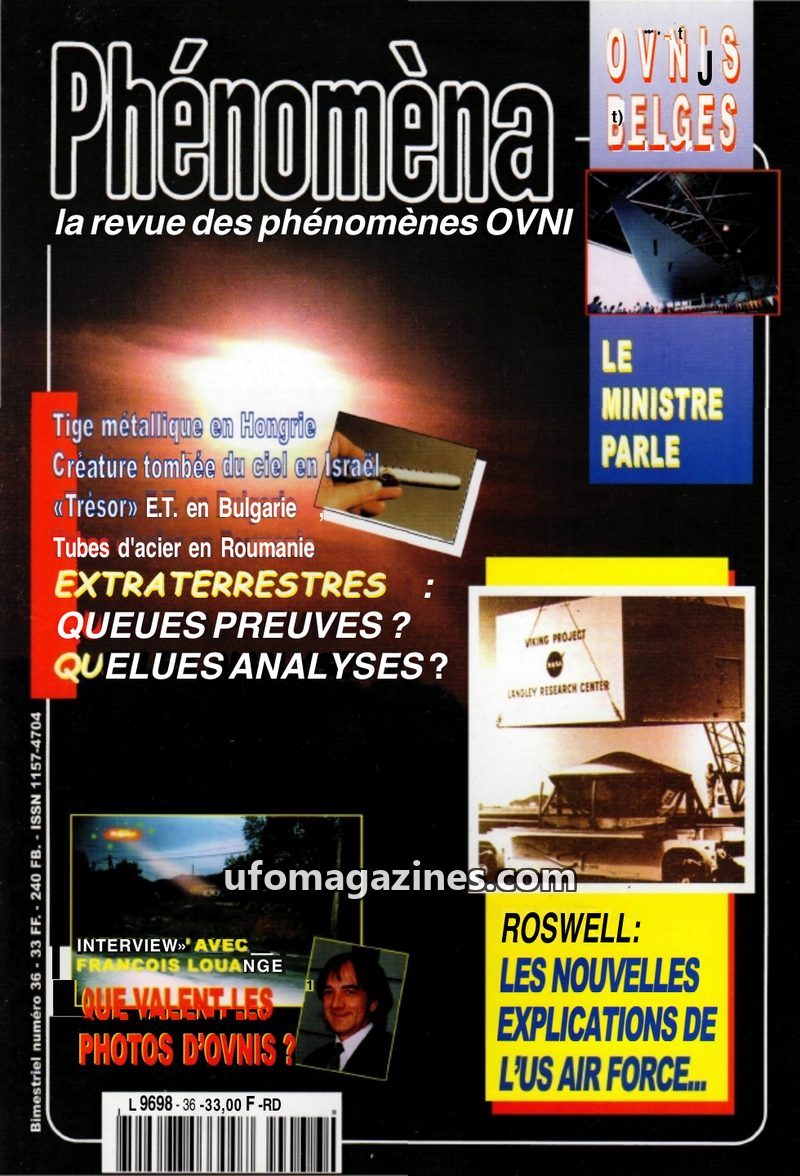 This issue of Phénomèna, dated 1997, focuses heavily on the US Air Force's renewed explanation of the Roswell incident, which claims the event involved mannequins and a secret Mogu
