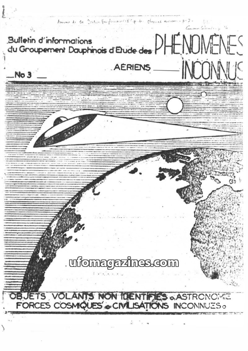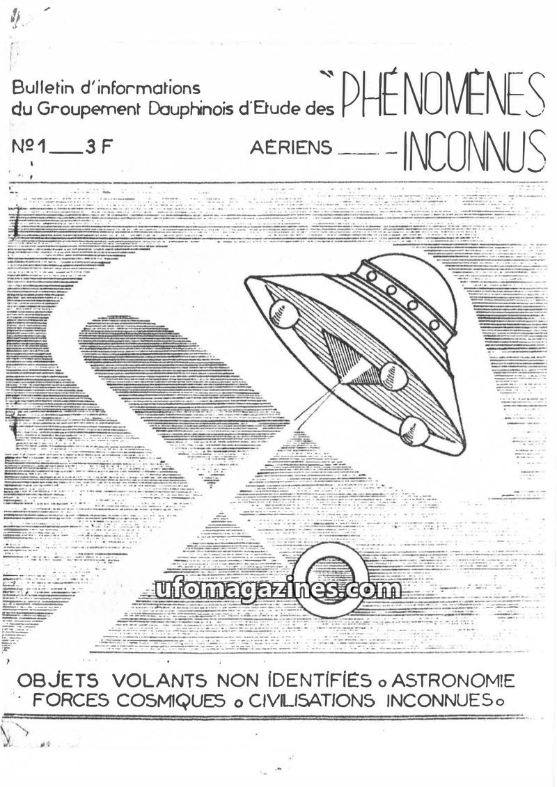 This is the first issue of the 'Phenomena Aeriens Inconnus' bulletin from the Groupement Dauphinois d'Etude des Phénomènes Aériens Inconnus (G.D.E.P.A.I.). The bulletin aims to inf