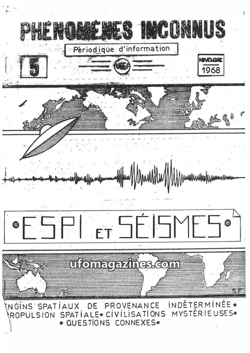 This issue of 'Phenomènes Inconnus' focuses on the potential link between UFO sightings (ESPI) and seismic events. It highlights research suggesting that seismic activity may be pr