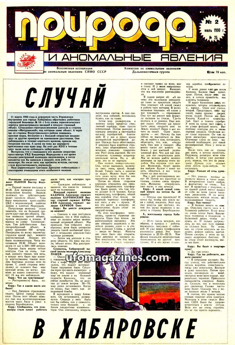 This issue of 'Nature and Anomalous Phenomena' details a significant UFO sighting in Khabarovsk on March 21, 1990, with multiple witness testimonies and reports of electronic inter