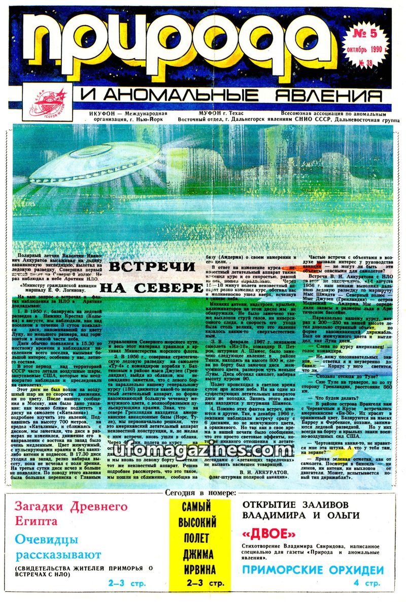 This issue of 'Priroda i anomalnye yavleniya' details UFO sightings in the Arctic by polar pilots, including descriptions of pearlescent disks and rapid ascents. It also covers his