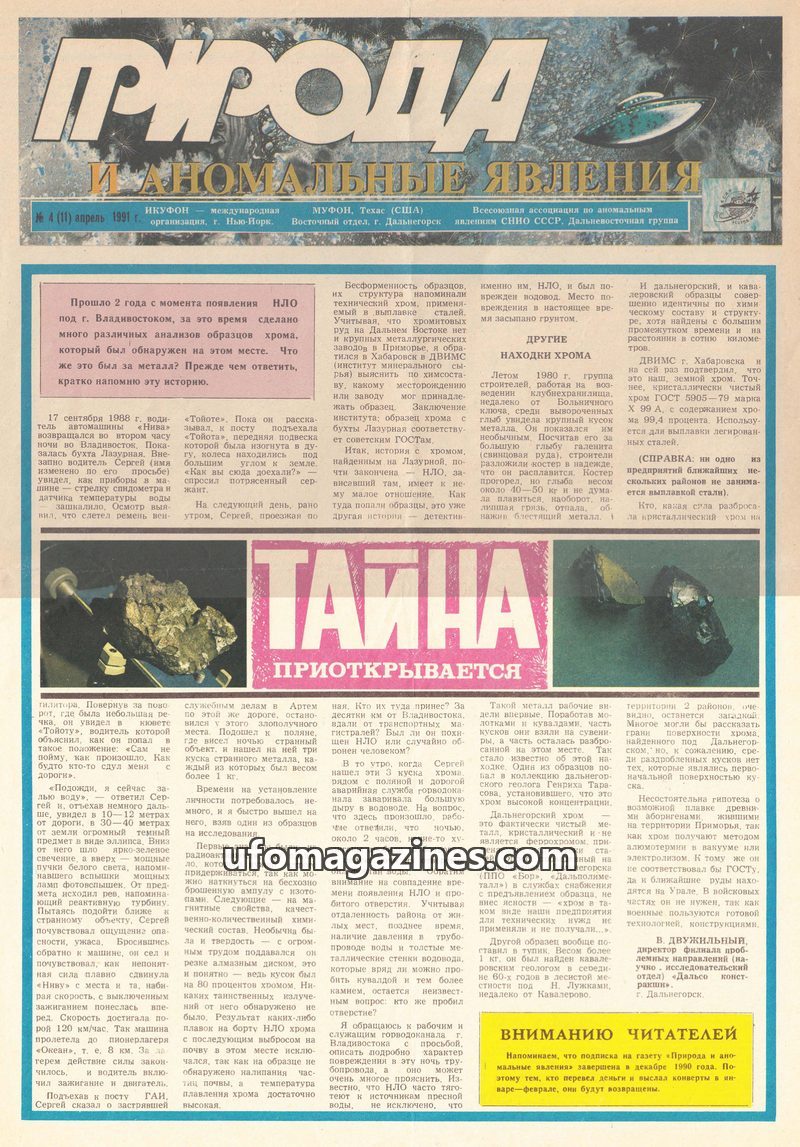 This issue of 'Nature and Anomalous Phenomena' investigates the mystery of chrome fragments found near Vladivostok, potentially linked to an UFO sighting in 1988. It also delves in