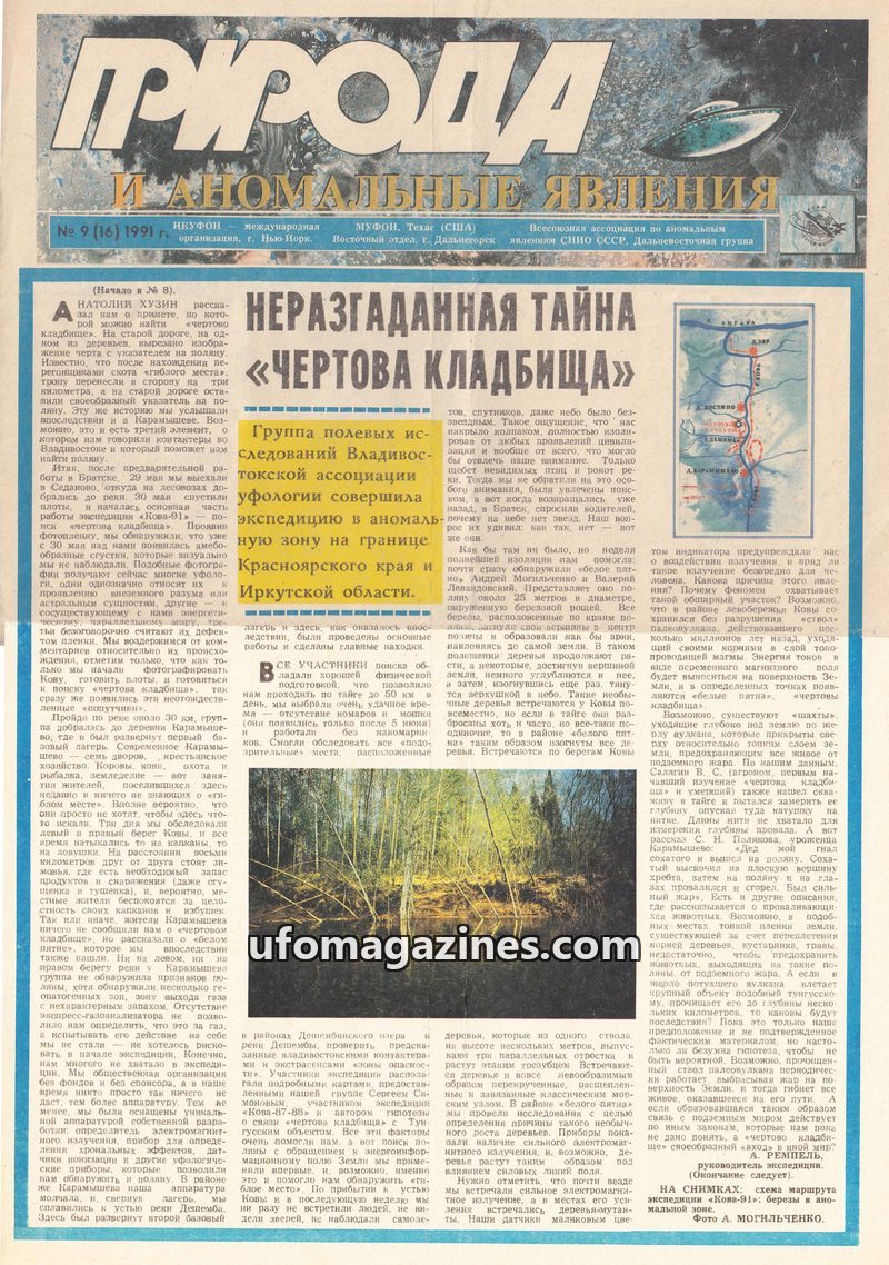 The magazine issue investigates the 'devil's graveyard' phenomenon in Siberia, detailing an expedition's findings of anomalous zones with strong electromagnetic radiation and stran