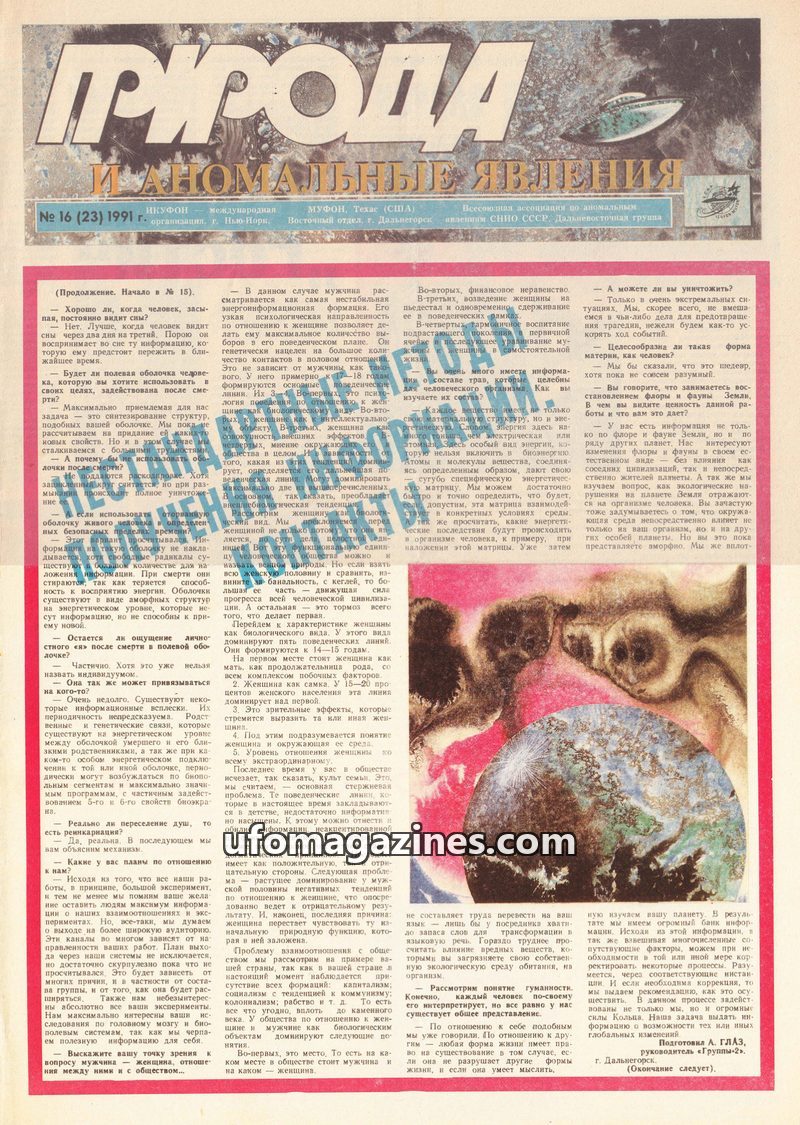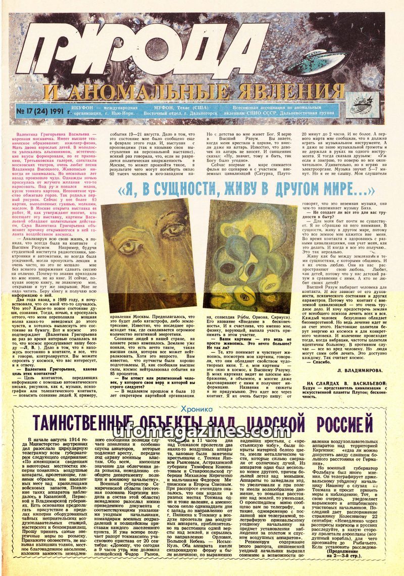 This issue features an interview with Valentina Vasilieva, a physicist and artist who claims to be in contact with higher intelligence and whose paintings are said to have healing